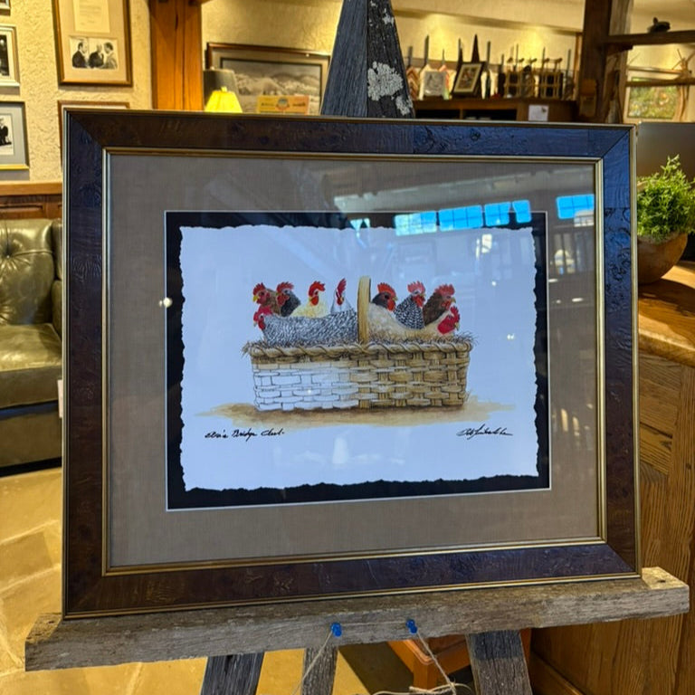 The painting pays tribute to the Charity League of Lexington, NC, which was founded in 1935 by Bob’s mother, Ella, and eight close friends during the hardships of the Great Depression. Their mission was simple yet powerful: to help children in need during difficult times. To honor the League’s 90th Anniversary, Bob drew inspiration from a cherished childhood memory. When he was five years old, his father Casper playfully referred to the sound of Ella’s bridge club as “a room full of hens clucking.” That lighthearted moment, combined with Bob’s recent painting of hens in a basket, sparked the vision for Ella’s Bridge Club. The piece features nine hens — one for each of the nine founding members — serving as both a work of art and a timeless story of community compassion.